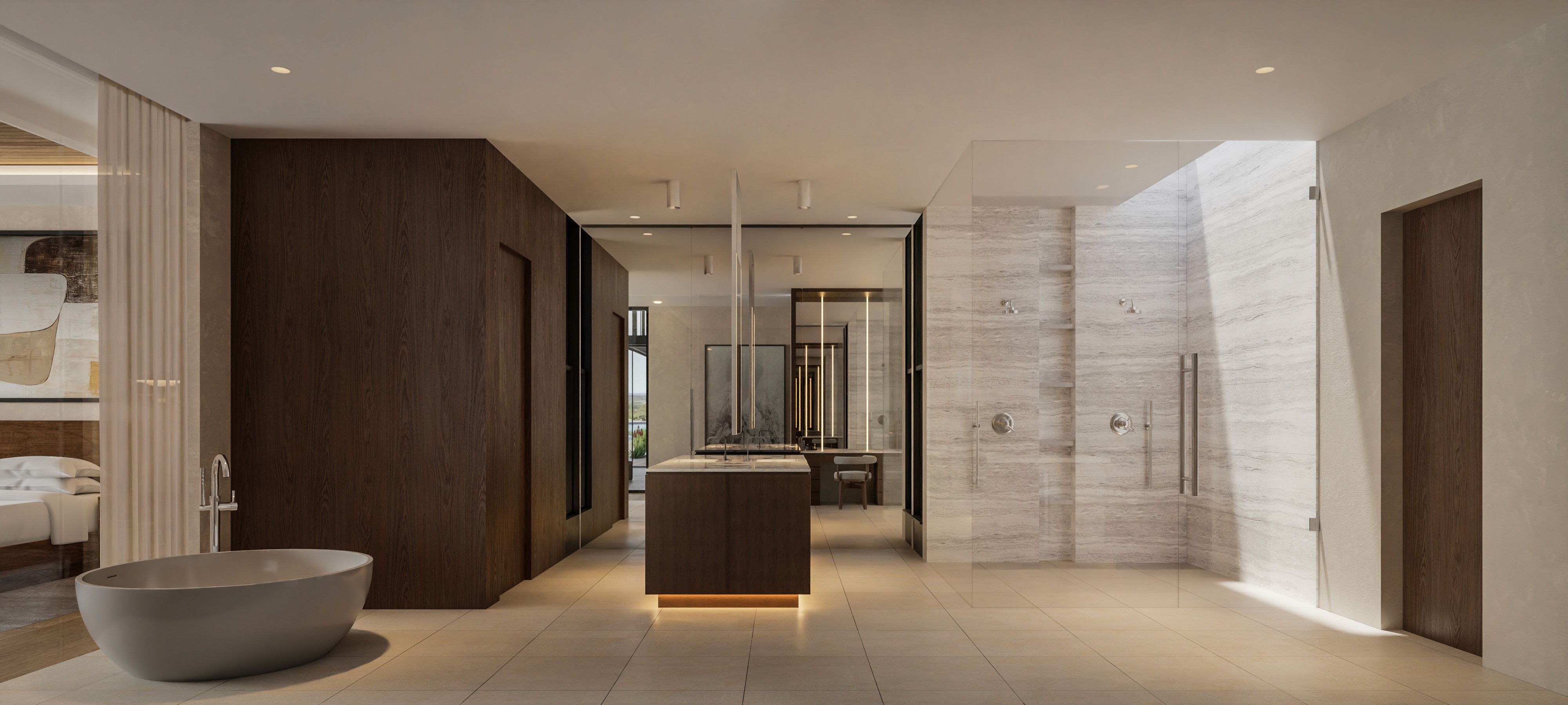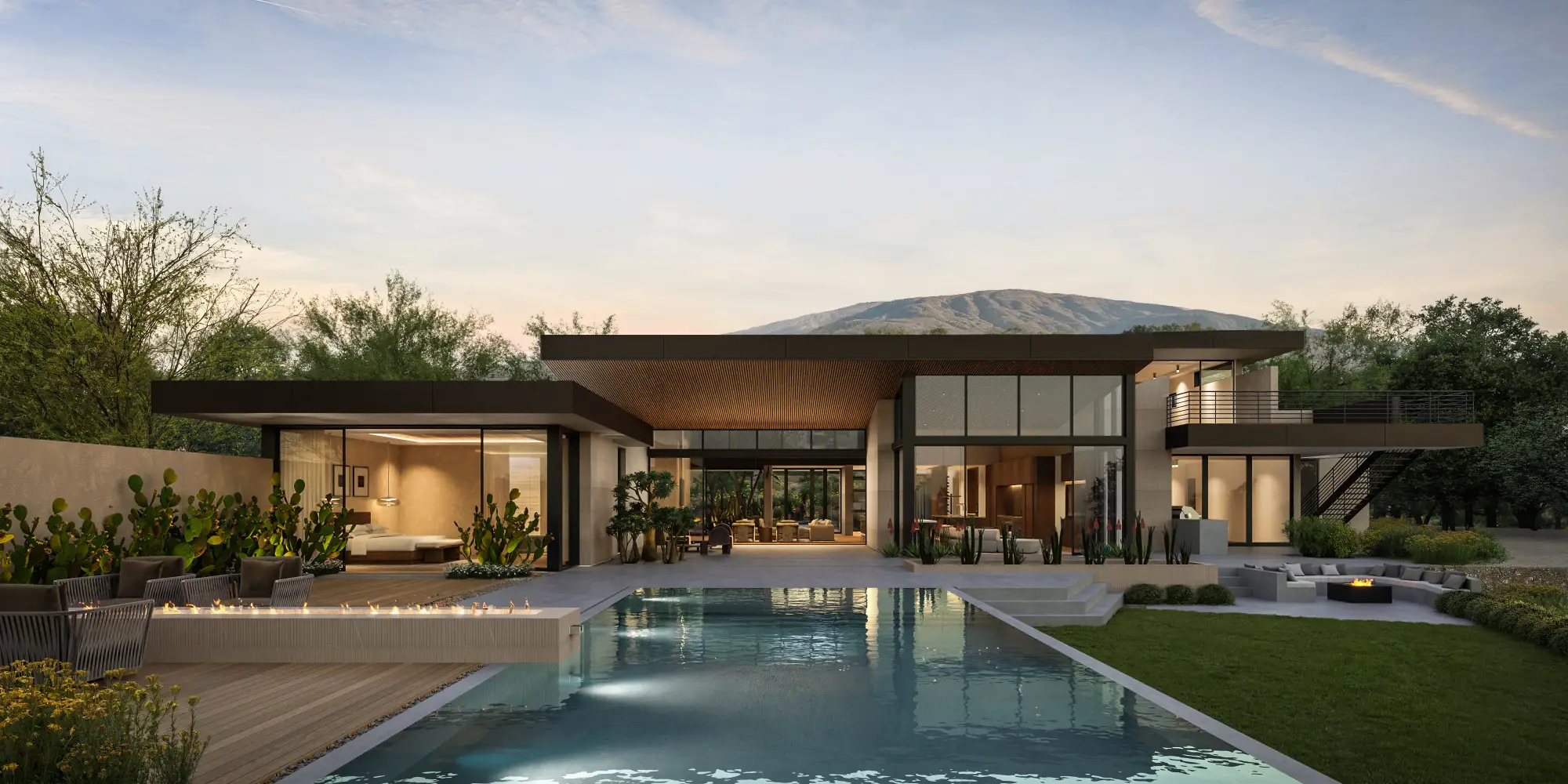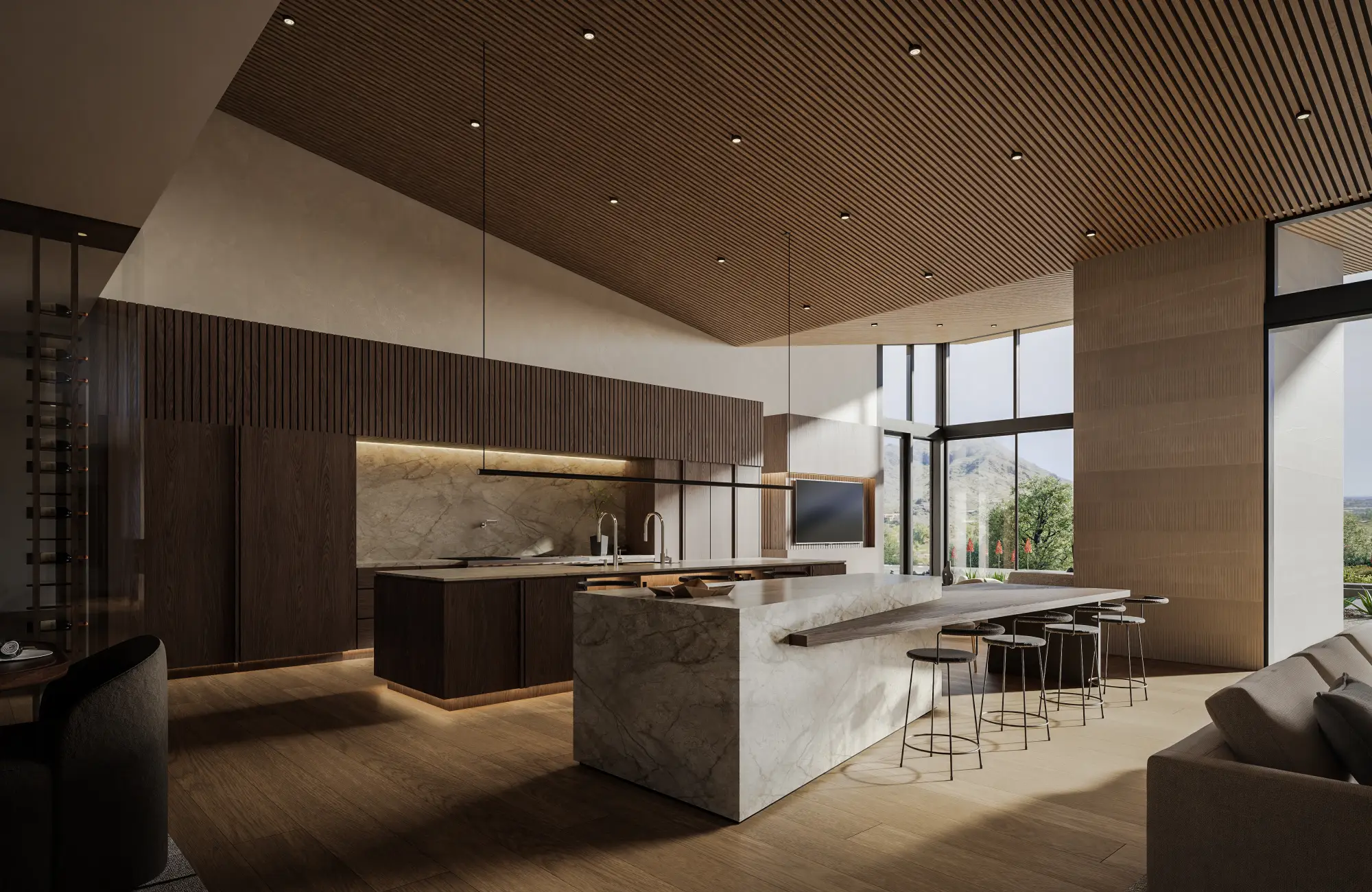 Low horizontal forms are grounded by textured stone and warm plaster, while deep steel roof lines and expansive glass create a seamless connection to the surrounding desert landscape. Native plantings and mature trees frame the approach, establishing a composed and intentional arrival. Interiors are warm and restrained, featuring wide plank oak floors, rift cut oak cabinetry, and finely crafted millwork. Linear wood slat ceilings add depth and rhythm, while large format stone surfaces anchor kitchens and baths. Softly integrated lighting highlights material transitions and reinforces the home’s tailored precision.
