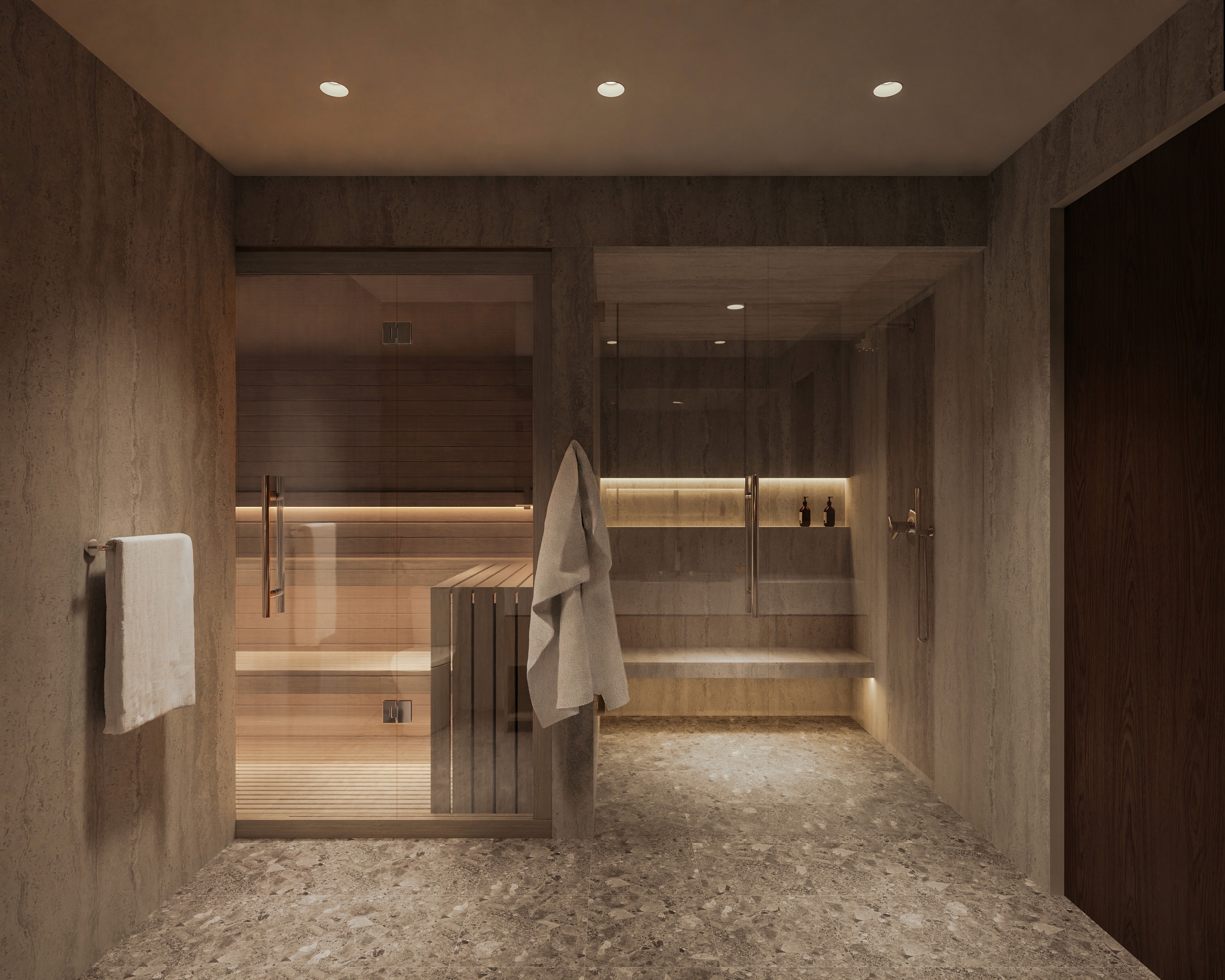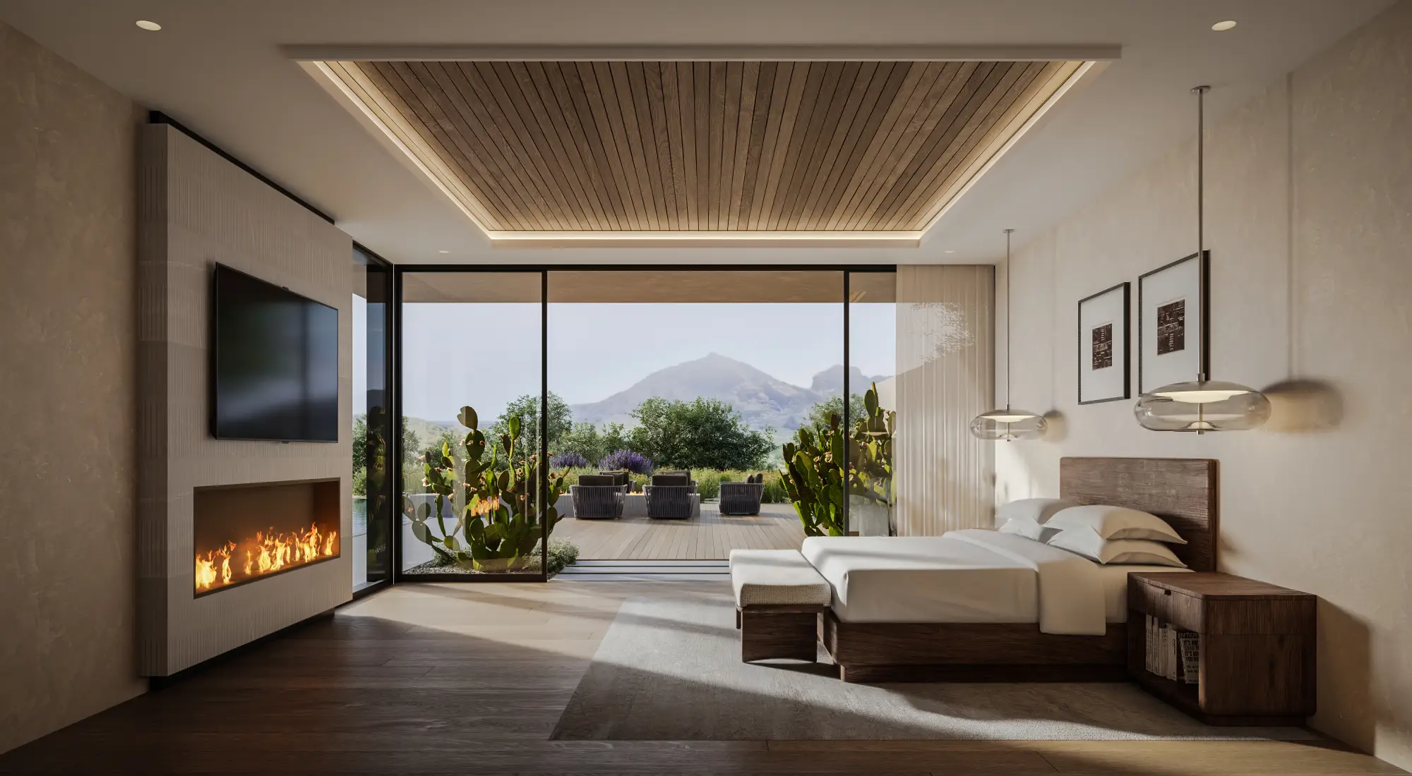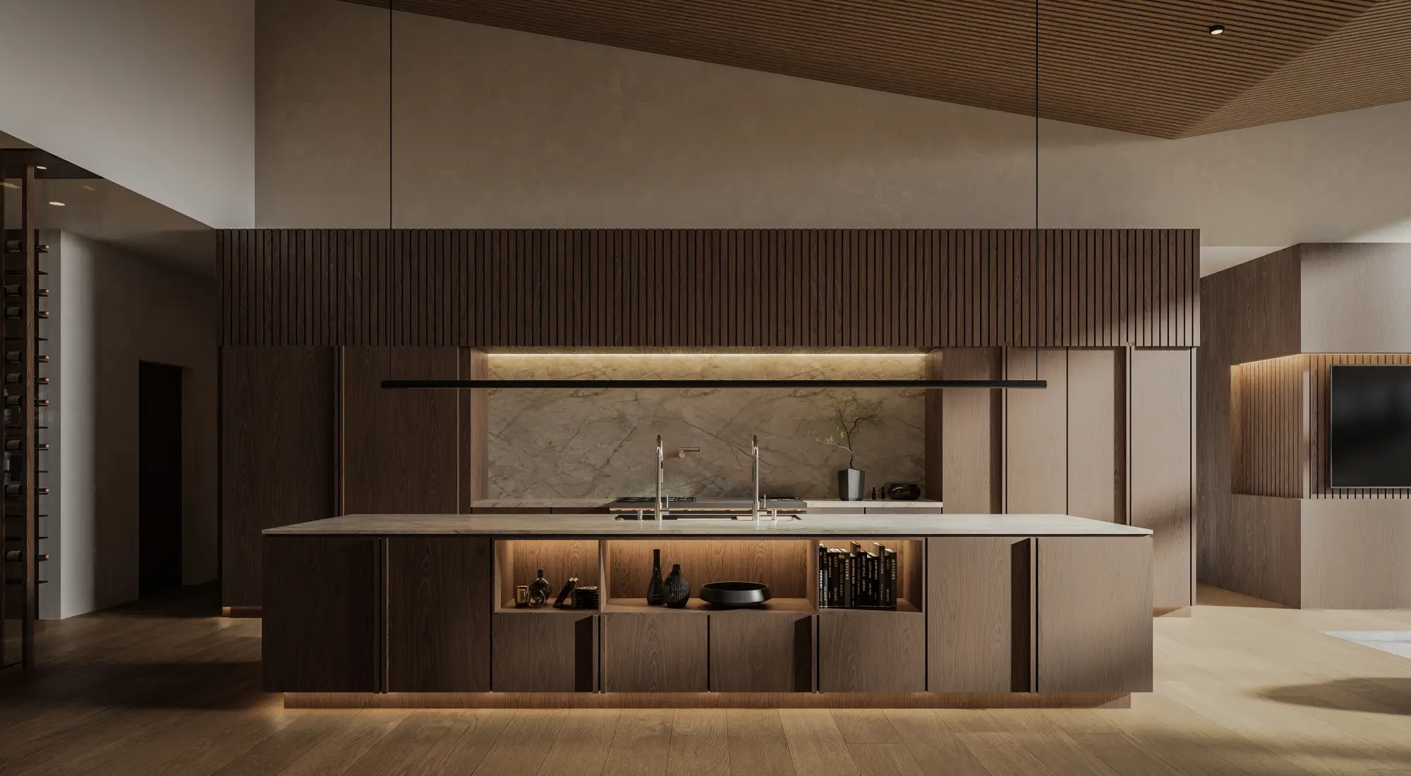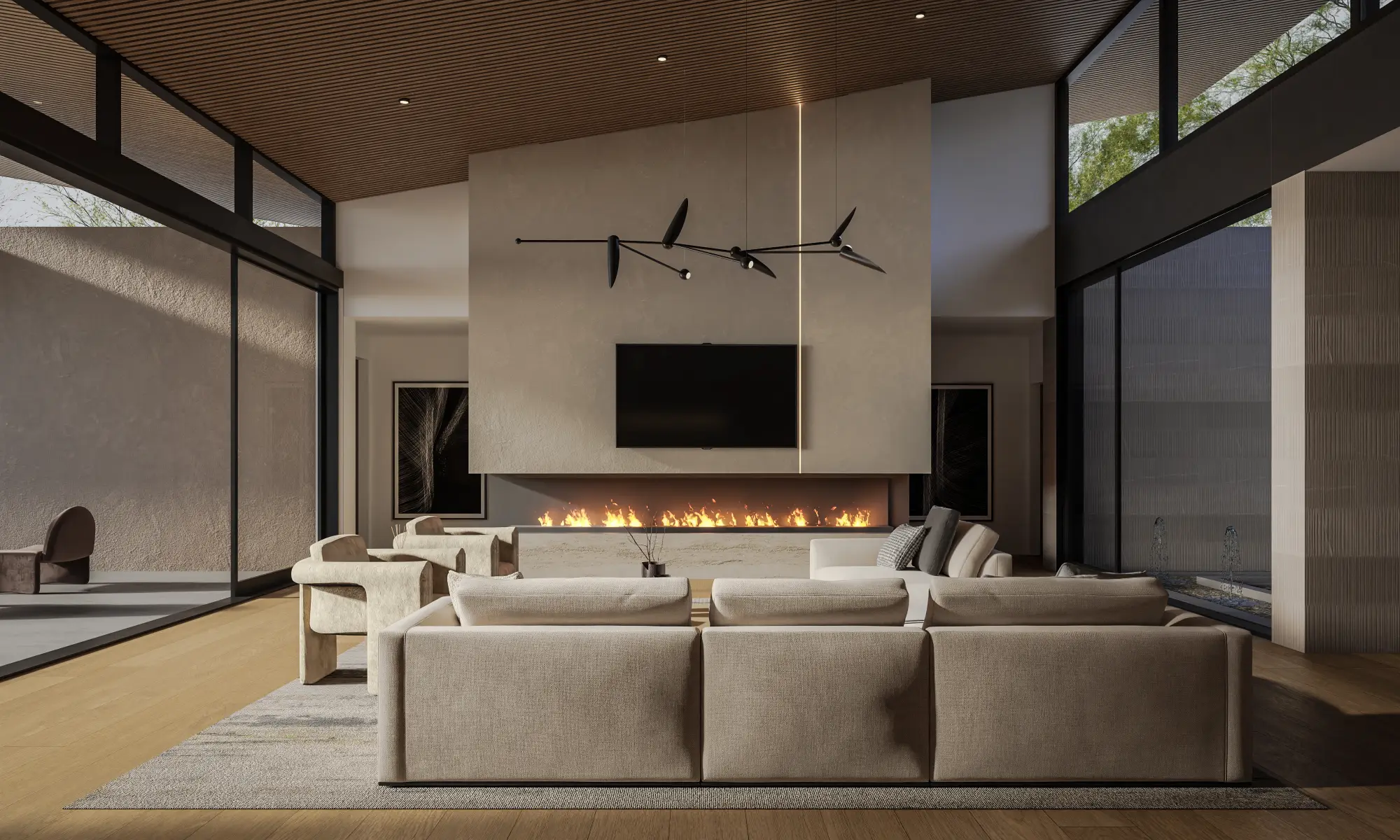 Low horizontal forms are grounded by textured stone and warm plaster, while deep steel roof lines and expansive glass create a seamless connection to the surrounding desert landscape. Native plantings and mature trees frame the approach, establishing a composed and intentional arrival. Interiors are warm and restrained, featuring wide plank oak floors, rift cut oak cabinetry, and finely crafted millwork. Linear wood slat ceilings add depth and rhythm, while large format stone surfaces anchor kitchens and baths. Softly integrated lighting highlights material transitions and reinforces the home’s tailored precision.