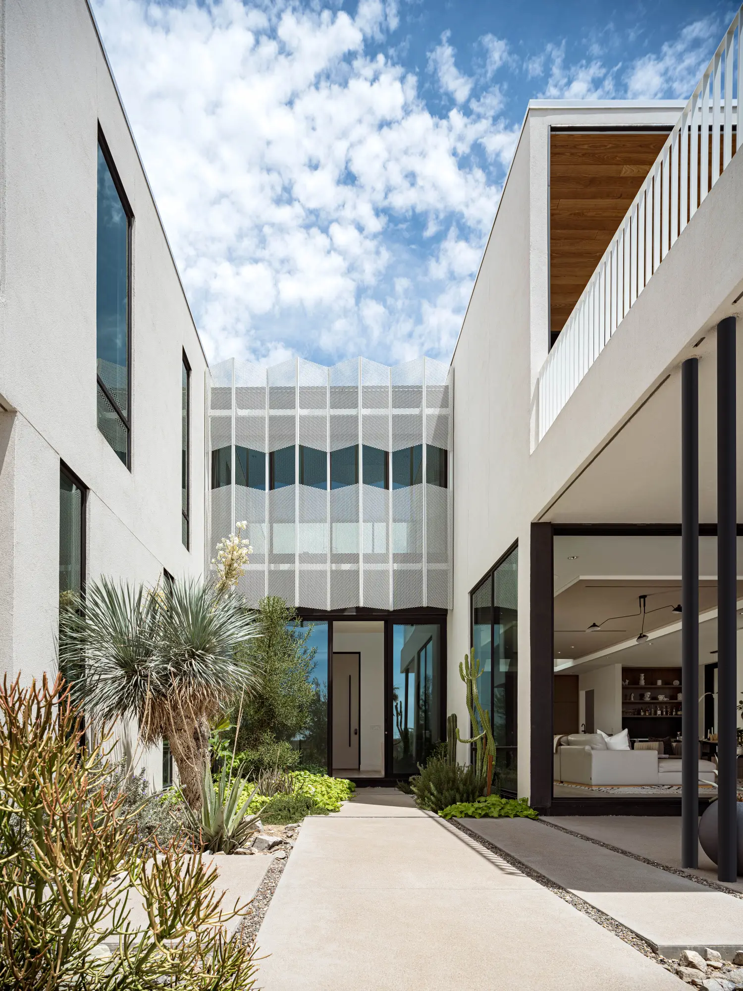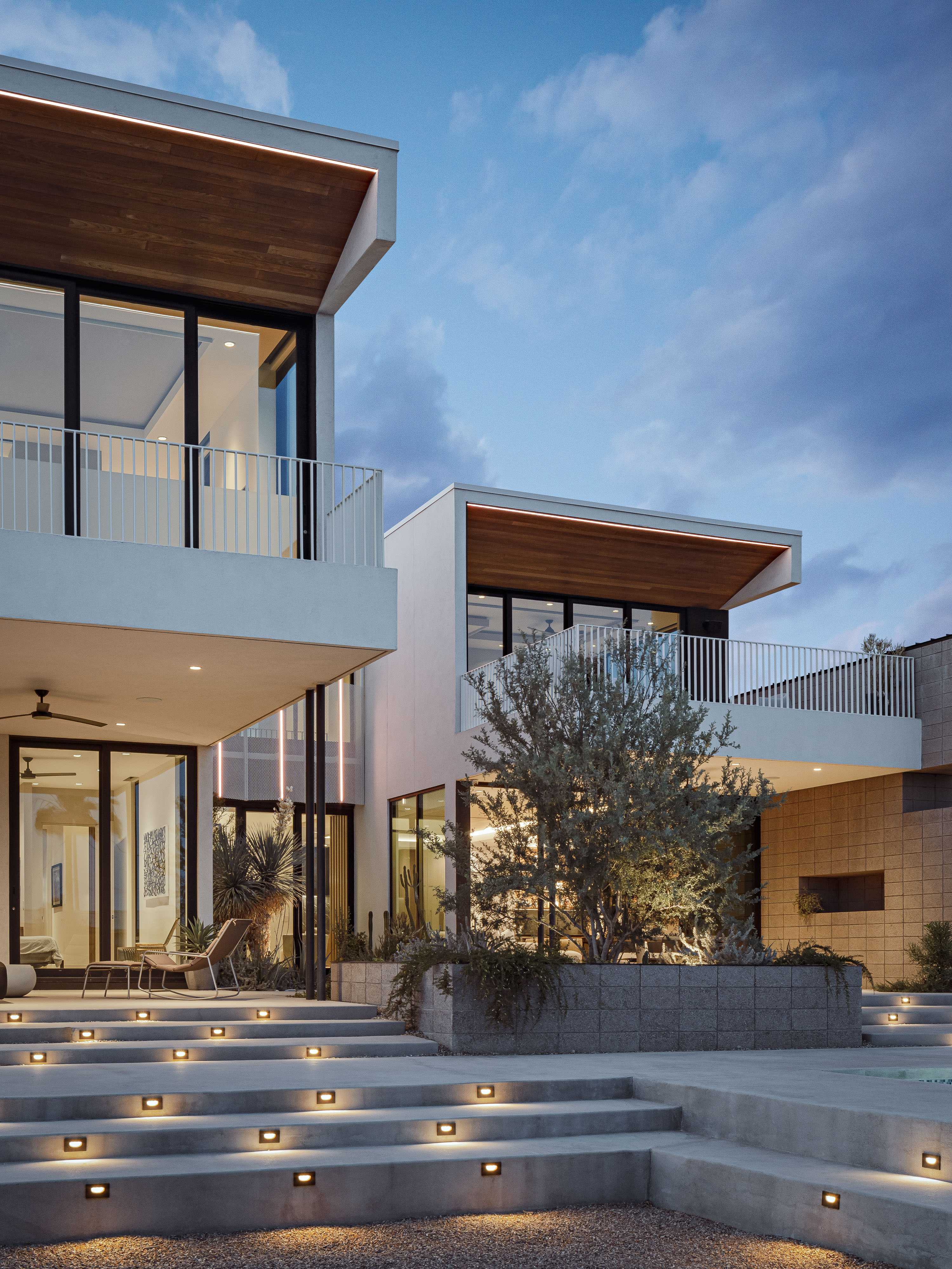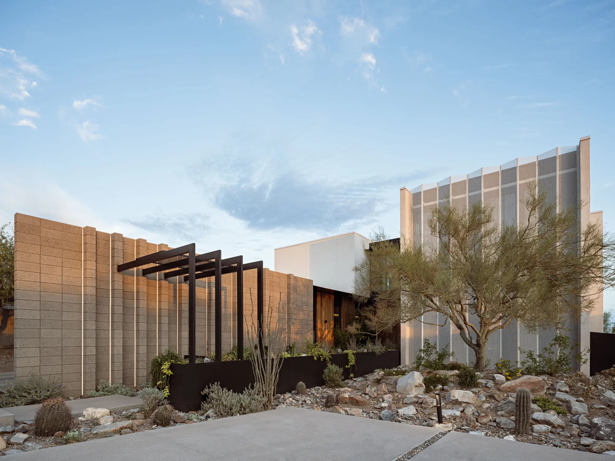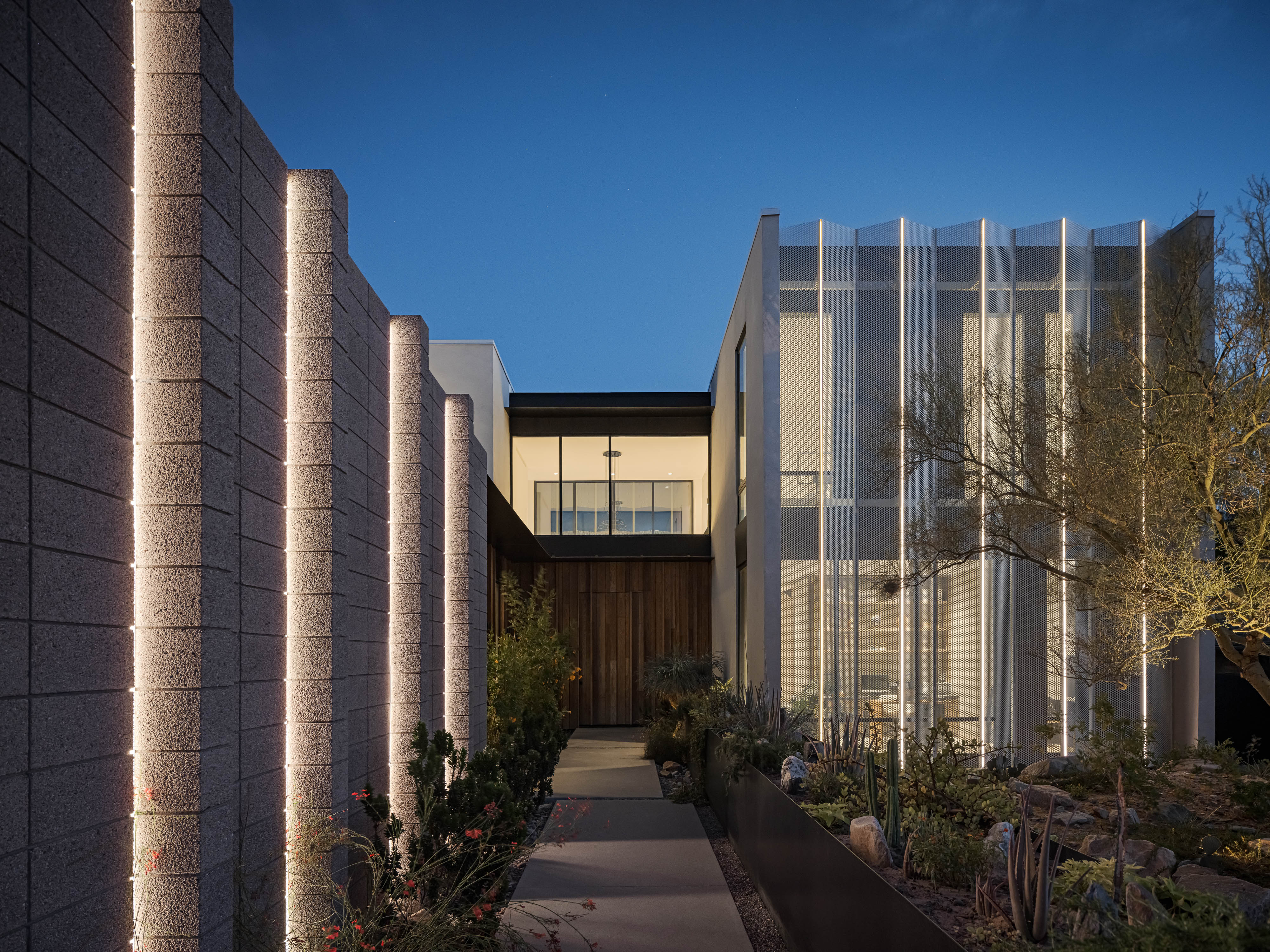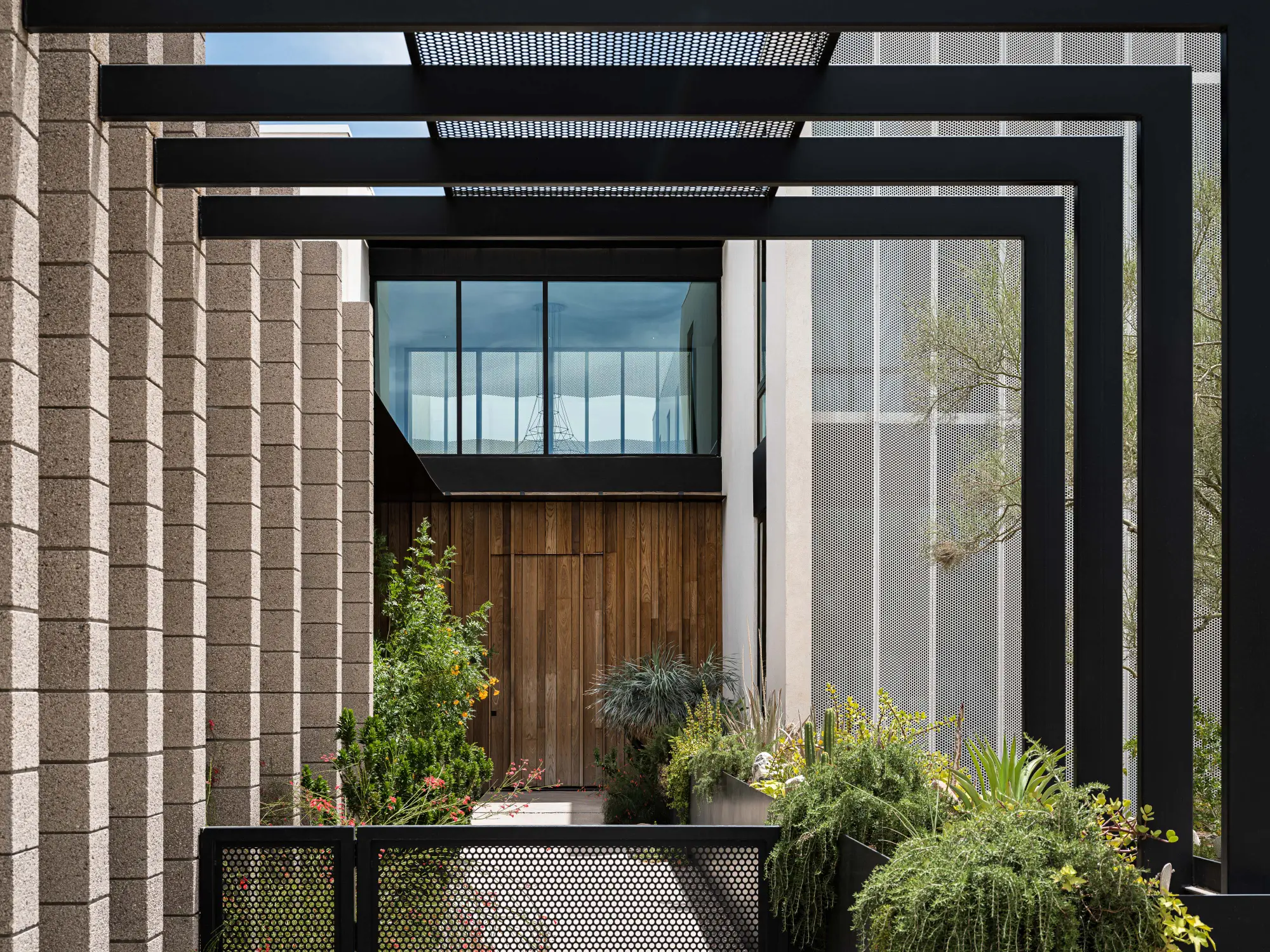 Sentinel is a striking modern home that blends bold architectural forms with intricate design details. This residence showcases technical expertise that's met with builder precision. The interplay in the diversity of materials from rough sandblasted block, warm natural wood, precise perforated metal screens, and large expanses of glass create an inviting yet striking form. With its thoughtfully designed yet simple arrangement, Sentinel embodies a harmony between functionality and artistry in contemporary living.